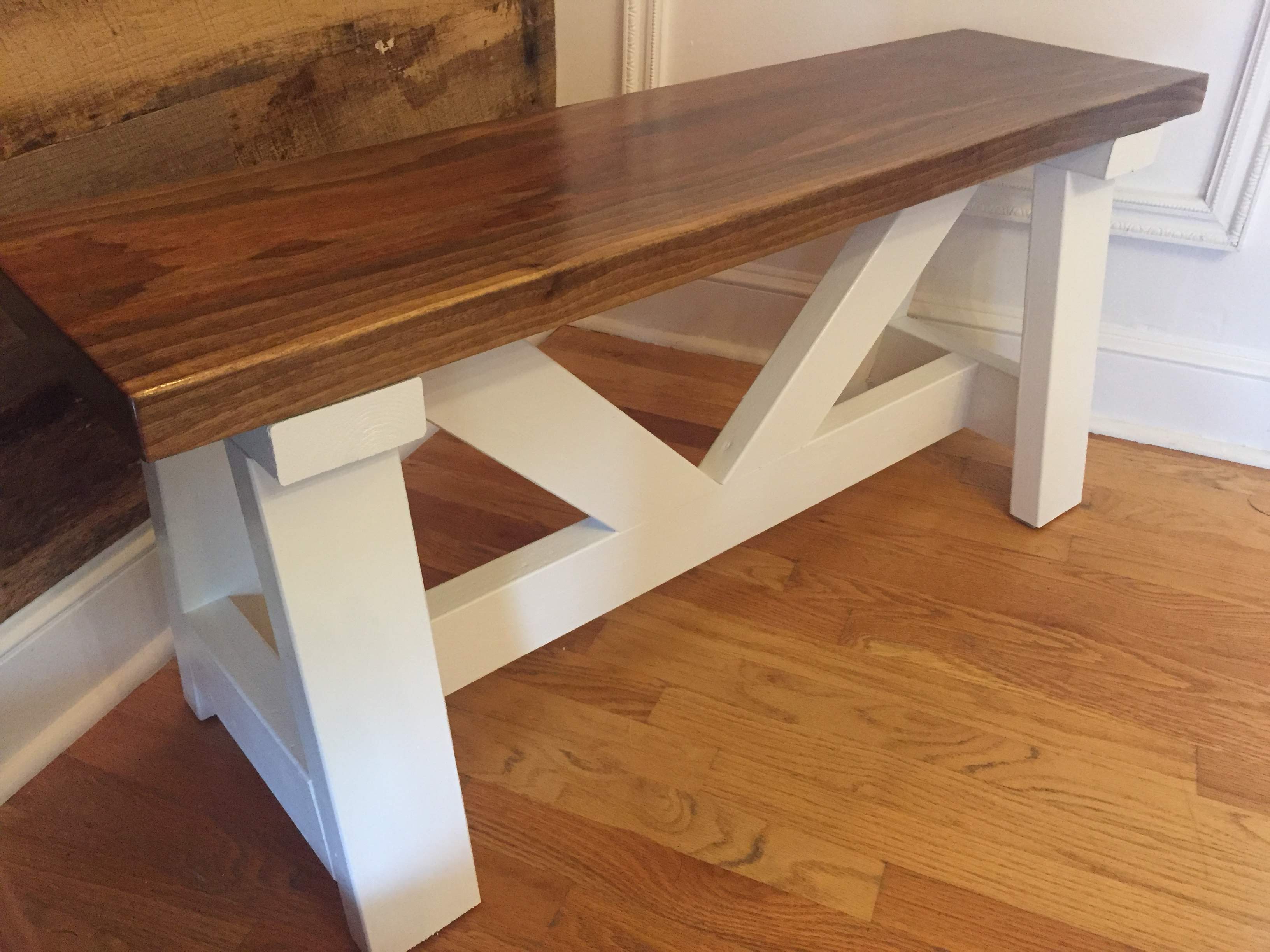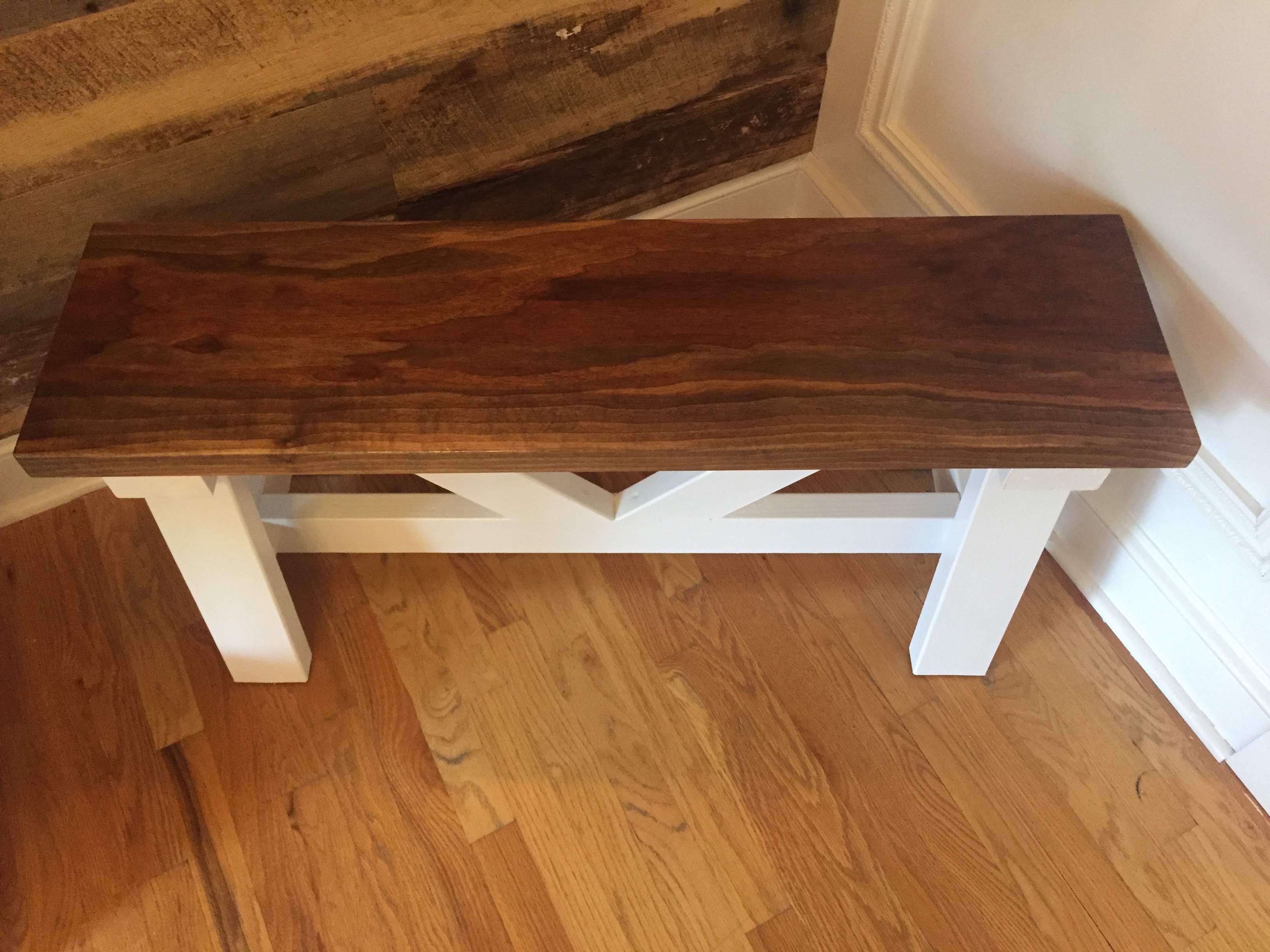 Black walnut farmhouse bench with white, a-frame, v-trestle base.