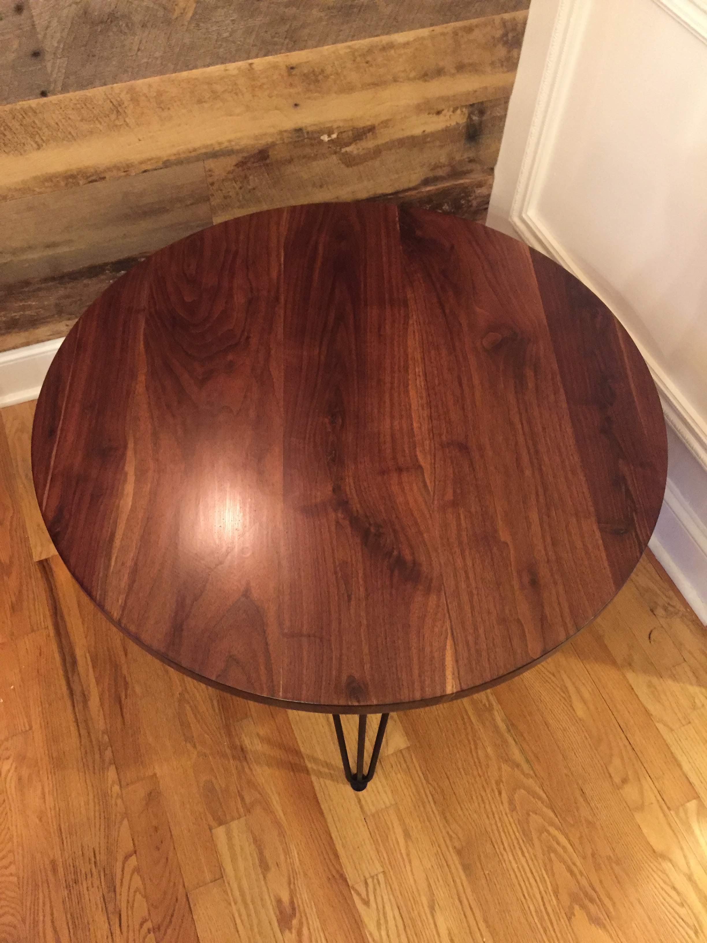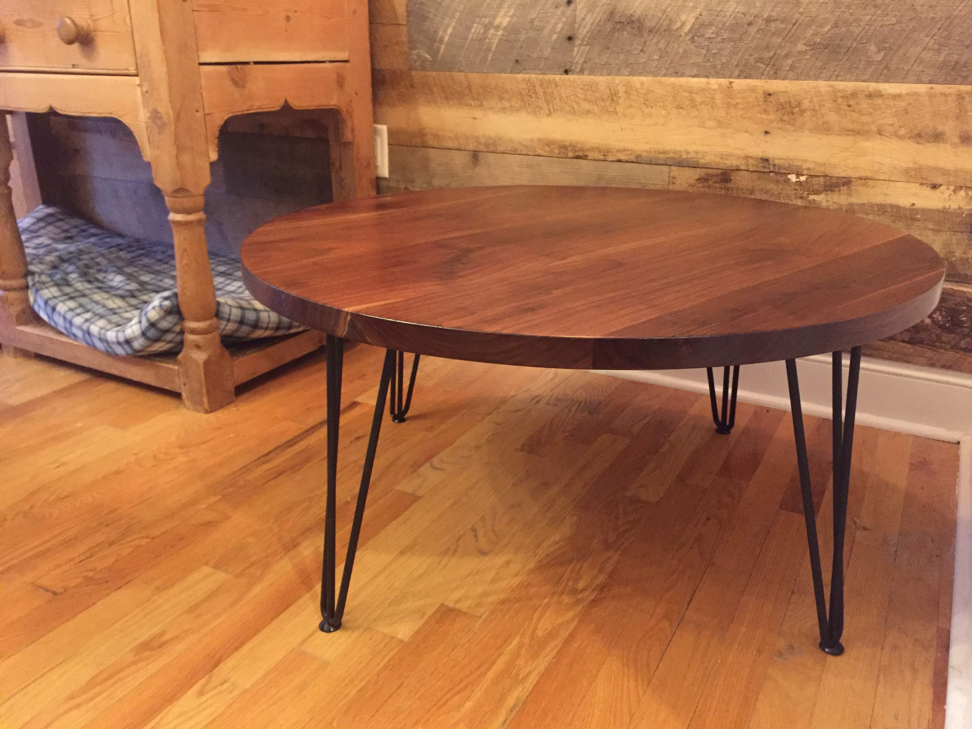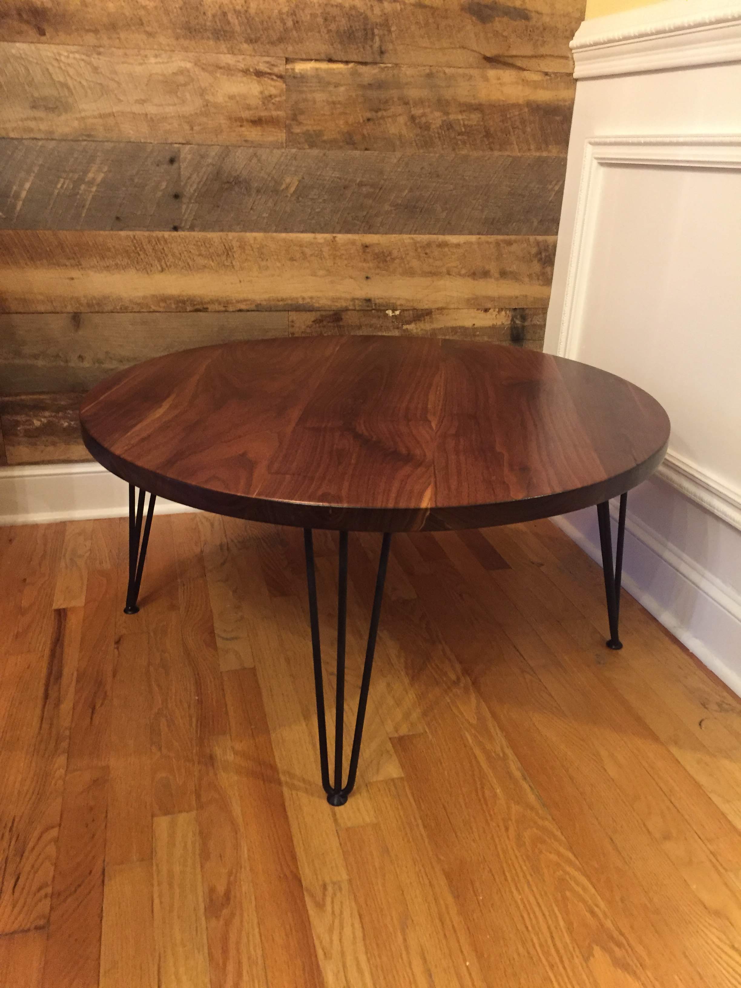 Black walnut coffee table with steel hairpin legs.