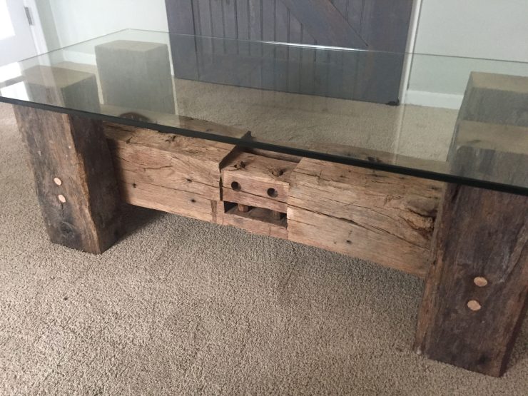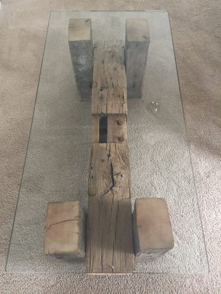 Constructed using salvaged barn beams reclaimed from an 1800s Connecticut barn. Hand hewn mortise and tenon 8″ x 8″ center beam is supported by 4.5″ x 6″ hand hewn legs complimented with a 2′ x 4′ , 1/2 inch tempered glass. Oak pegs provide the structural support to withstand the test of time.